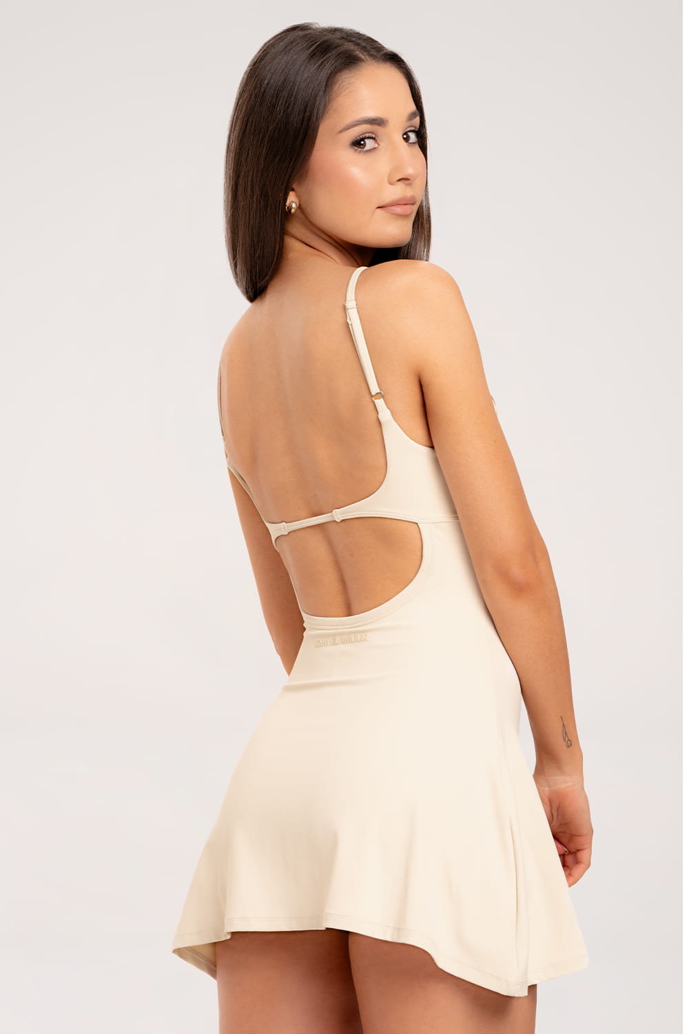 Двупластова мини рокля с елегантна цепка, съчетаваща женствен стил с функционалност. Вътрешният слой състои се от удобно боди с крачоли, осигуряващо комфорт и свобода на движение. С вграден сутиен с чашки с изваждащи се подплънки, който деликатно подчертава бюста. Благодарение на регулируемите презрамки роклята перфектно приляга по тялото, а дълбокото деколте на гърба придава по-чувствен характер. Блестящото лого в долната част на гърба. допълва цялостната визия.